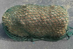 Ici un filet à foin modèle baluchon XL. Permet une manutention simple et rapide pour la distribution de foin sous format « petite botte »